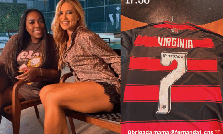 Virginia exibiu uma camisa personalizada do Rubro-Negro, com seu nome estampado e o número 7, eternizado pelo namorado nos tempos de Flamengo. “Obrigada, mama”, agradeceu a influenciadora, animada com o gesto.