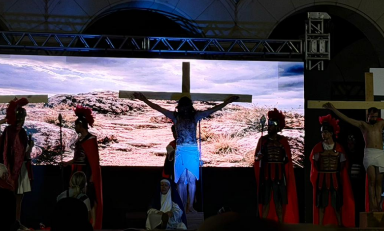 Um dos grandes destaques da noite foi a estrutura do espetáculo, que contou com telões de LED exibindo os cenários de cada momento da narrativa. O recurso trouxe ainda mais profundidade às cenas, tornando a experiência visual rica e envolvente, como se o público estivesse acompanhando de perto cada passo da caminhada de Jesus até a cruz.