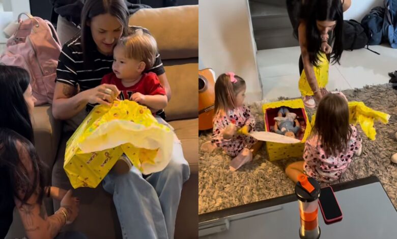 Zé Felipe encantou os seguidores nesta terça-feira (21/10) ao compartilhar um vídeo mostrando Ana Castela presenteando seus filhos, Maria Alice, Maria Flor e José Leonardo, frutos de seu relacionamento com Virginia Fonseca. Nos registros, é possível ver a cantora interagindo de forma afetuosa com as crianças, entregando brinquedos e ajudando-as a abrir os embrulhos.